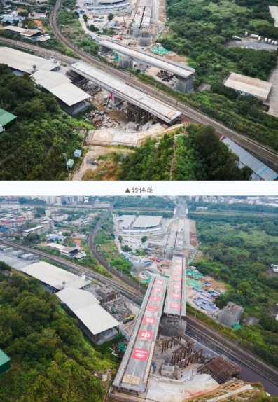 當天7時04分,轉體橋梁開始轉體,經(jīng)過44分鐘施工,成功完成高空“二人轉”,為下一步順利實現(xiàn)通車運營奠定堅實基礎。轉體橋上跨既有漳龍線、龍東線及煤場專用線3條鐵路貨運營業(yè)線,距離營業(yè)線最近距離僅5.9米,施工難度大,危險系數(shù)高。