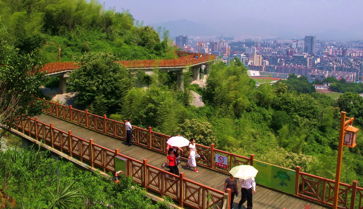 蓮花山底南環(huán)路地面標(biāo)高為330米,山頂標(biāo)高為490.606米,山高160米左右,山頂已開發(fā)為休閑場所,并建有世紀(jì)鐘樓,山腳可挖掘的景點不多,因此決定在半山腰開辟一條市民休閑的木棧道,將公園增加一個休閑觀光的好場所,并可成為蓮花山一道亮麗的風(fēng)景線。因此在半山腰422米高程建設(shè)一條環(huán)山的木棧道。為盡量少破壞山體植被,木棧道采用棧道橋形式,全長3781.88米,全寬3.5米(包括欄桿寬度),凈寬3.0米,蓮花山棧道橋工程總投資7610萬元。